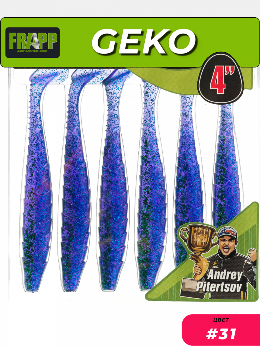 Приманка силиконовая Frapp Geko — виброхвост средних пропорций с характерной «чешуйчатой» поверхностью. «Пятка» имеет округлую, каплеобразную форму. При проводке у Geko выраженно играет живой хвостик и практически отсутствует «роллинг» — покачивание вокруг продольной оси.