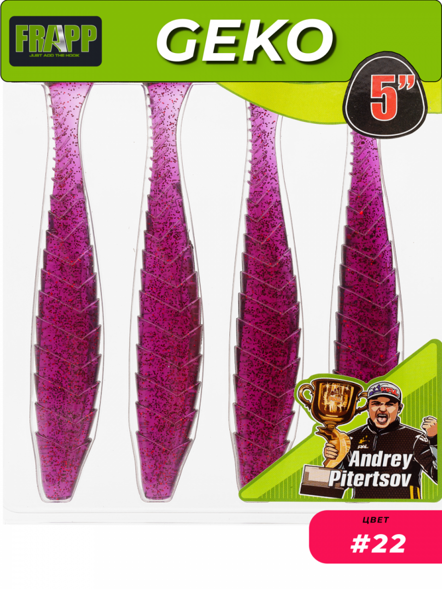 Приманка силиконовая Frapp Geko — виброхвост средних пропорций с характерной «чешуйчатой» поверхностью. «Пятка» имеет округлую, каплеобразную форму. При проводке у Geko выраженно играет живой хвостик и практически отсутствует «роллинг» — покачивание вокруг продольной оси.