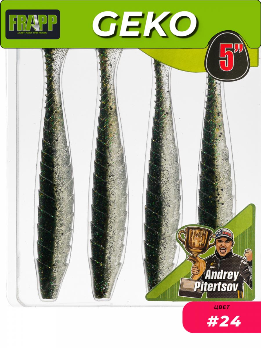 Приманка силиконовая Frapp Geko — виброхвост средних пропорций с характерной «чешуйчатой» поверхностью. «Пятка» имеет округлую, каплеобразную форму. При проводке у Geko выраженно играет живой хвостик и практически отсутствует «роллинг» — покачивание вокруг продольной оси.