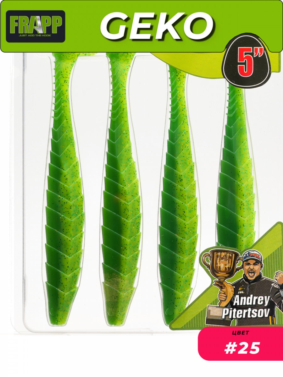 Приманка силиконовая Frapp Geko — виброхвост средних пропорций с характерной «чешуйчатой» поверхностью. «Пятка» имеет округлую, каплеобразную форму. При проводке у Geko выраженно играет живой хвостик и практически отсутствует «роллинг» — покачивание вокруг продольной оси.