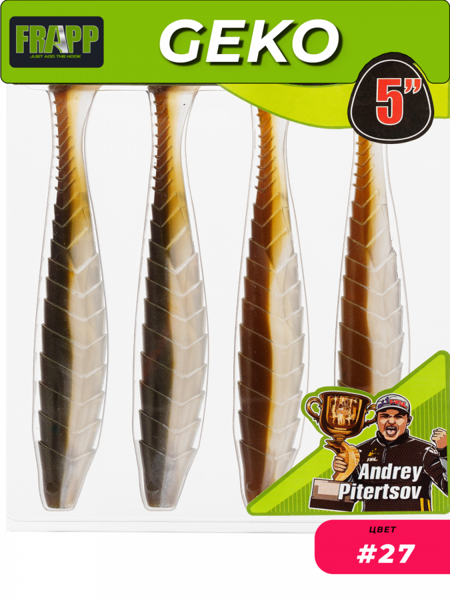 Приманка силиконовая Frapp Geko — виброхвост средних пропорций с характерной «чешуйчатой» поверхностью. «Пятка» имеет округлую, каплеобразную форму. При проводке у Geko выраженно играет живой хвостик и практически отсутствует «роллинг» — покачивание вокруг продольной оси.