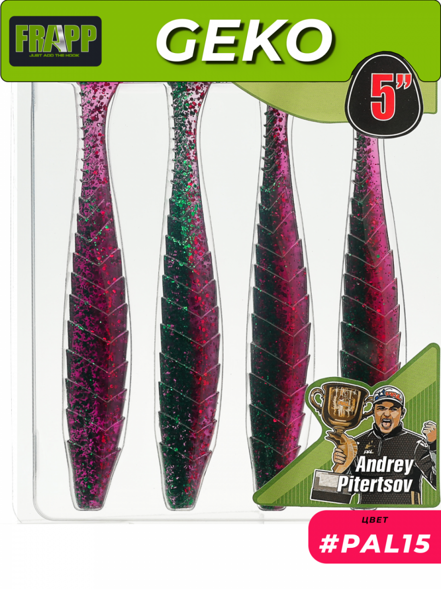 Приманка силиконовая Frapp Geko — виброхвост средних пропорций с характерной «чешуйчатой» поверхностью. «Пятка» имеет округлую, каплеобразную форму. При проводке у Geko выраженно играет живой хвостик и практически отсутствует «роллинг» — покачивание вокруг продольной оси.